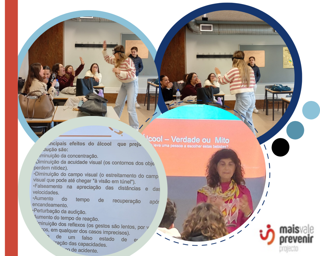 A atividade termina com uma experiência prática utilizando óculos de simulação de visão em estado de embriaguez, permitindo aos alunos compreender de forma concreta como o álcool pode afetar a coordenação motora, o equilíbrio e a perceção do ambiente envolvente.